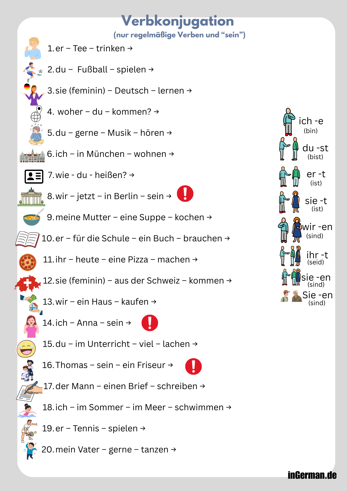 A1.1.: Verbkonjugation (Seite 1: mit trennbaren Verben, Seite 2: ohne trennbare Verben)