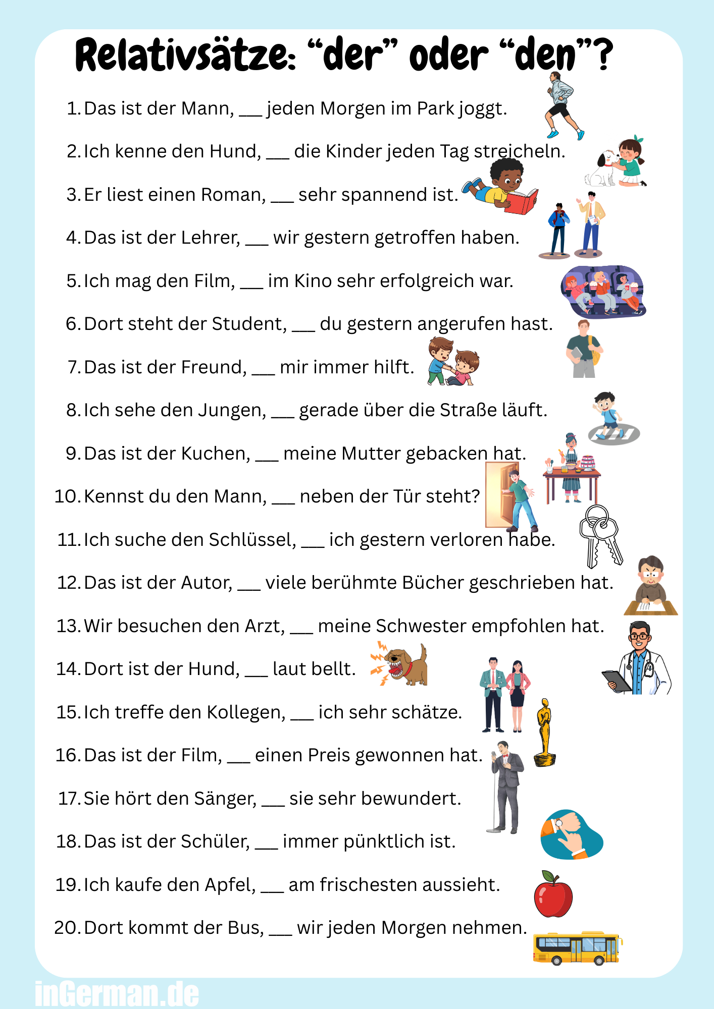 Relativsätze mit Nominativ, Akkusativ und Dativ Lösung